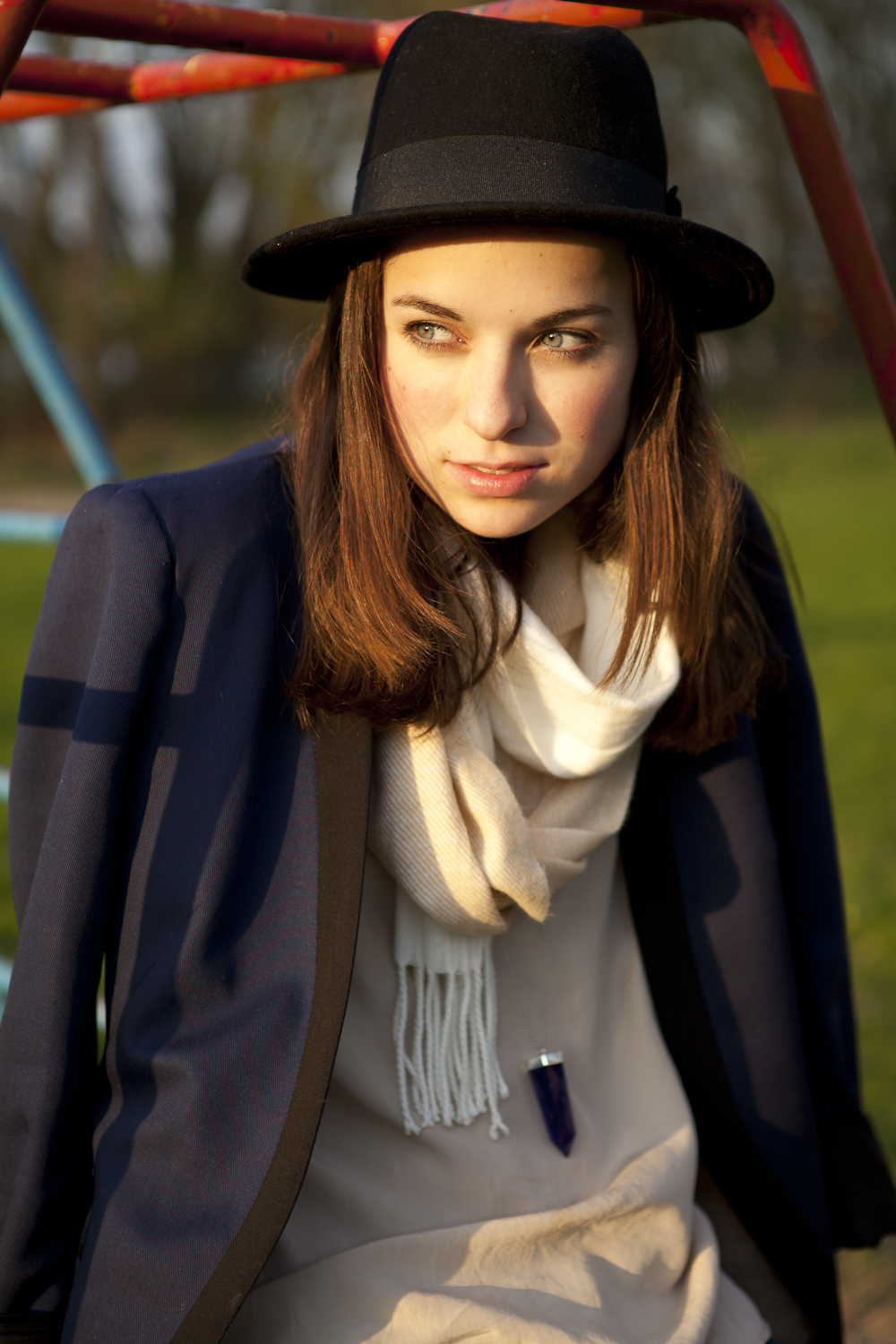 From head to toe: Hat from H&M, Weekday scarf, blazer and top both from Zara, Necklace from Fashionology, metallic satchel from ASOS, cheap monday jeans and glittery lace-up shoes from 3suisses.